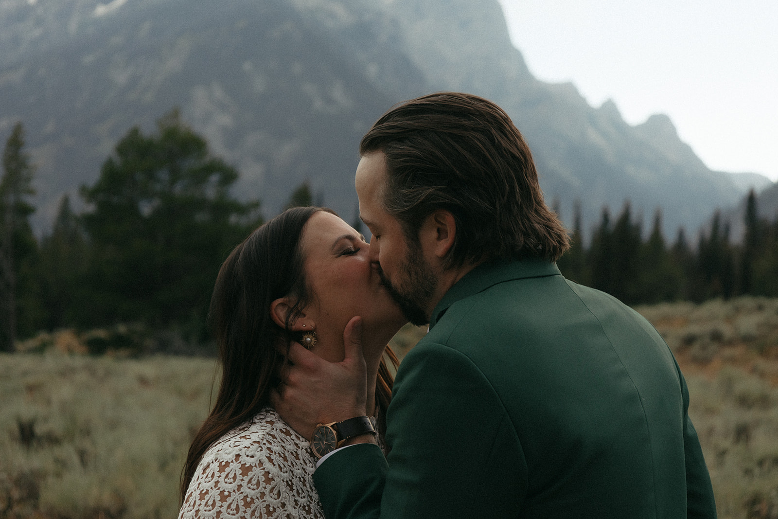 Makenna wore a fitted, boho lace dress that looked stunning against the dark, stormy backdrop. And Evan — in his deep green suit — stood out perfectly against the moody tones of the mountains. The way those colors came together was unreal. It felt like the whole scene was made just for them.