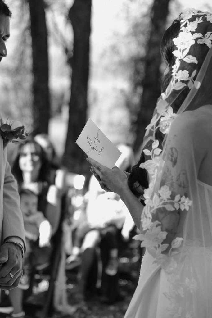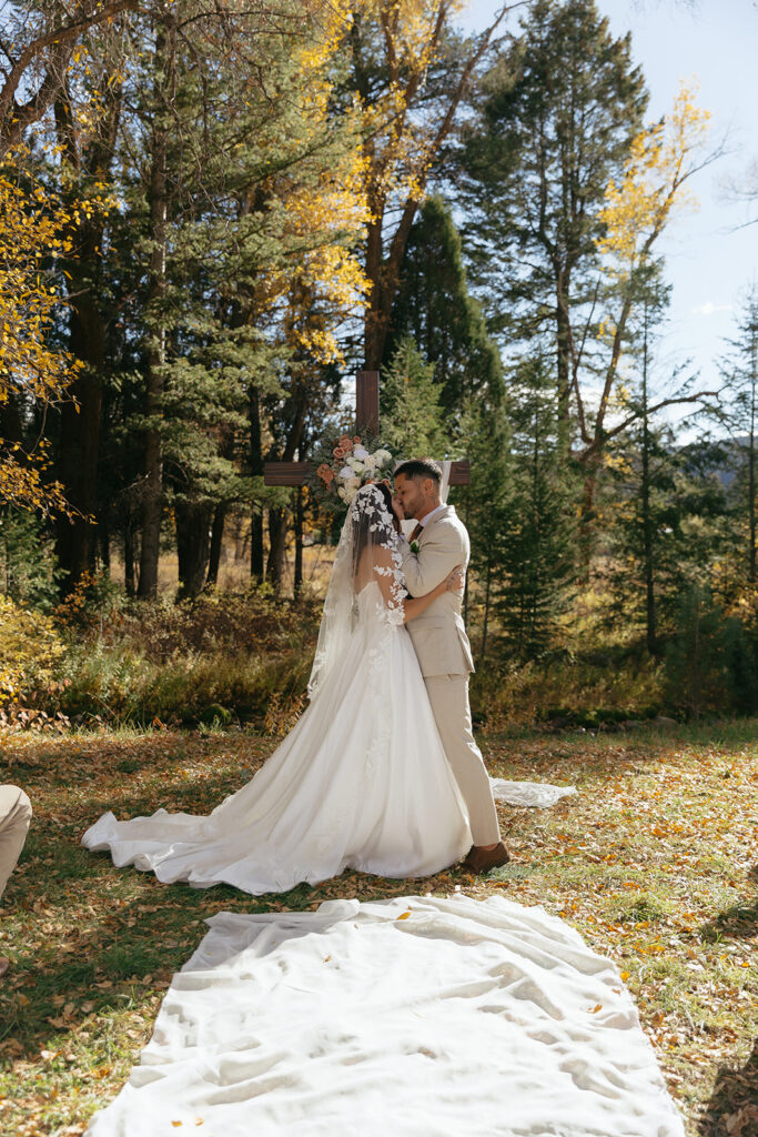 Their ceremony took place in the most serene spot by the creek, framed by a sentimental wooden cross that served as their altar — a beautiful touch that made the setting feel deeply personal. Paige wore a stunning gown with a cathedral veil that caught the light every time the wind picked up. She looked absolutely radiant standing beside Julian, who couldn’t stop smiling at her the entire ceremony.