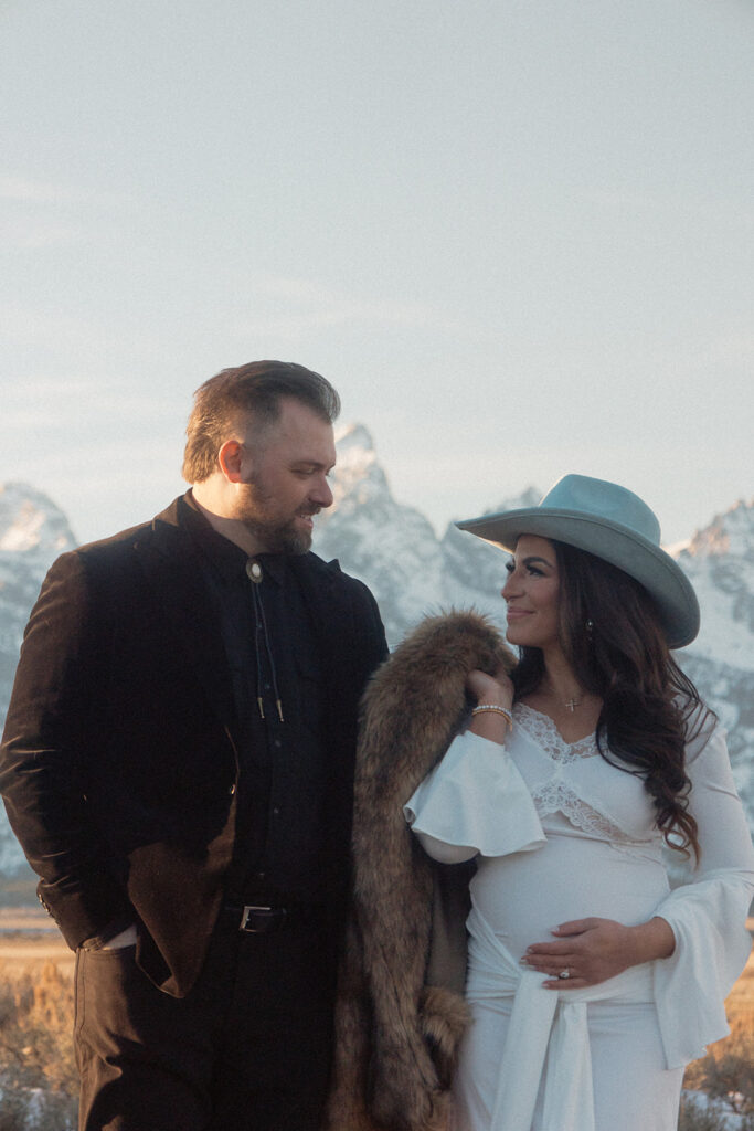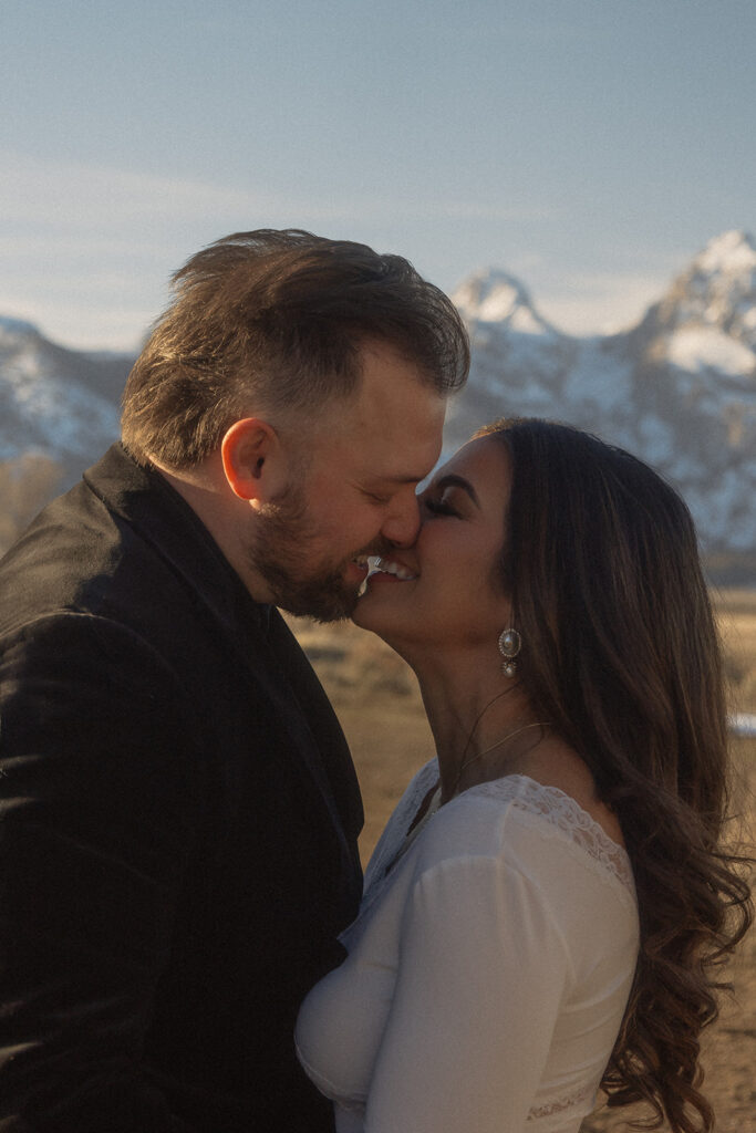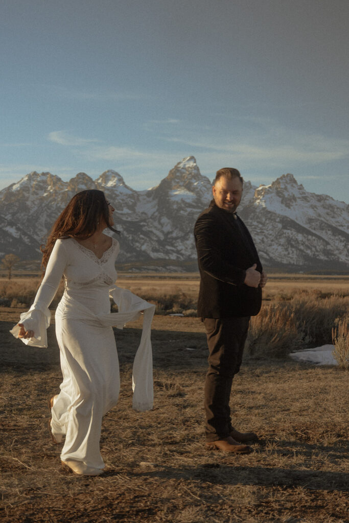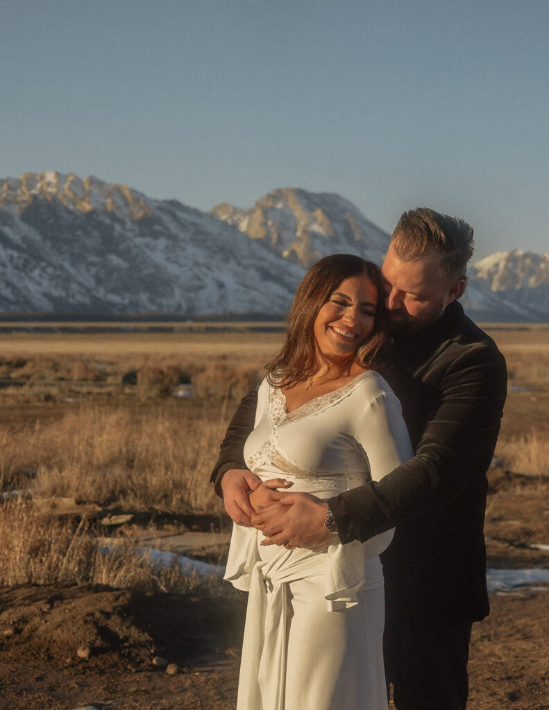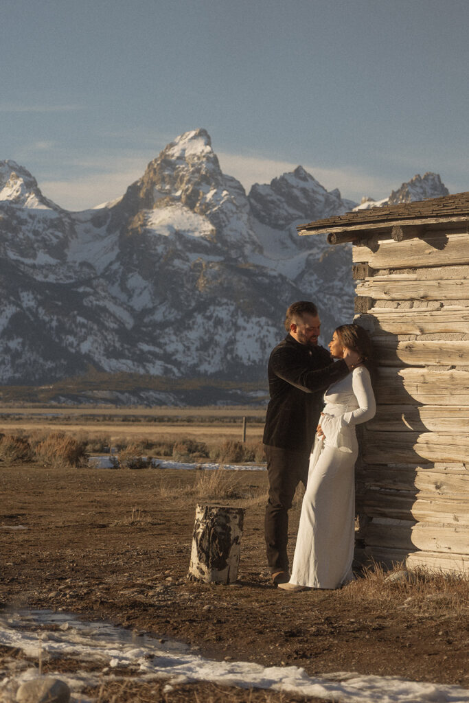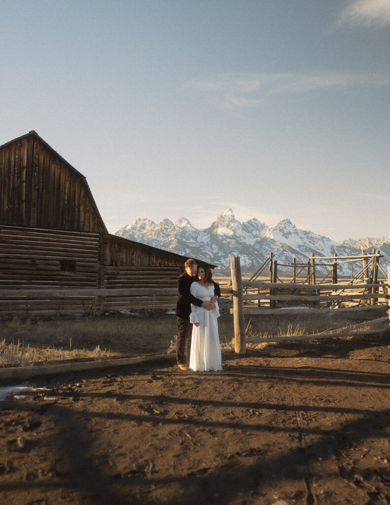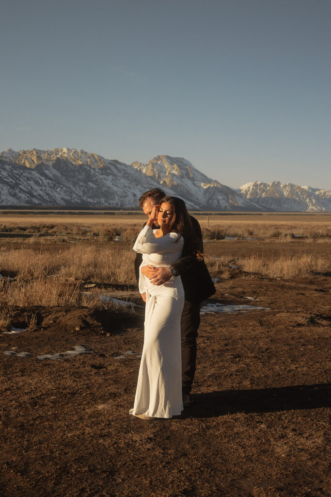 The Tetons stood behind them as the sun dropped low, casting soft winter light across Mormon Row. The mountains held steady, the air stayed gentle, and everything aligned in a way that felt deeply intentional — especially for a moment that had been so long in the making.