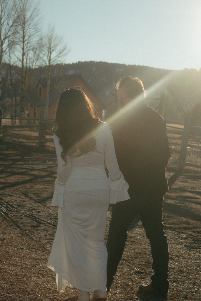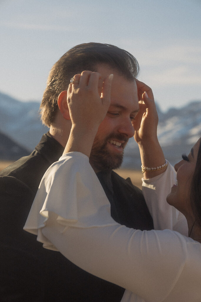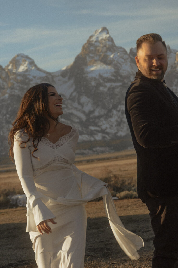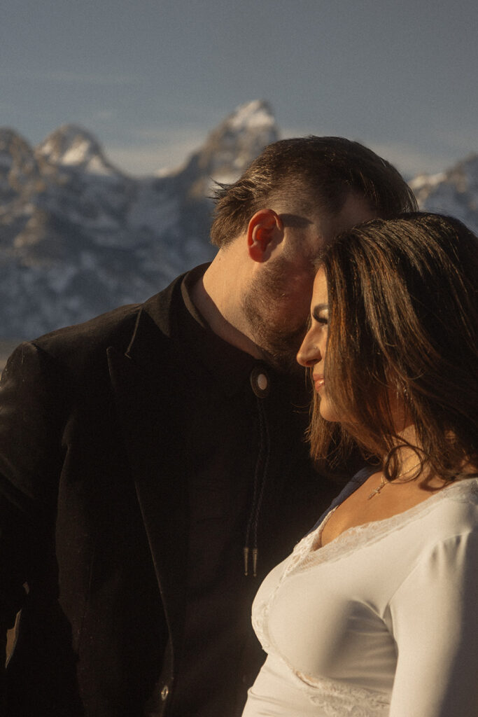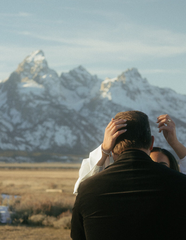 Jen wore a stunning lace white dress that felt timeless and soft against the winter landscape, while Brad wore a velvet tuxedo-inspired look that added richness and contrast. Together, their styling felt elevated yet grounded — classic with a Western edge that fit Jackson Hole beautifully.