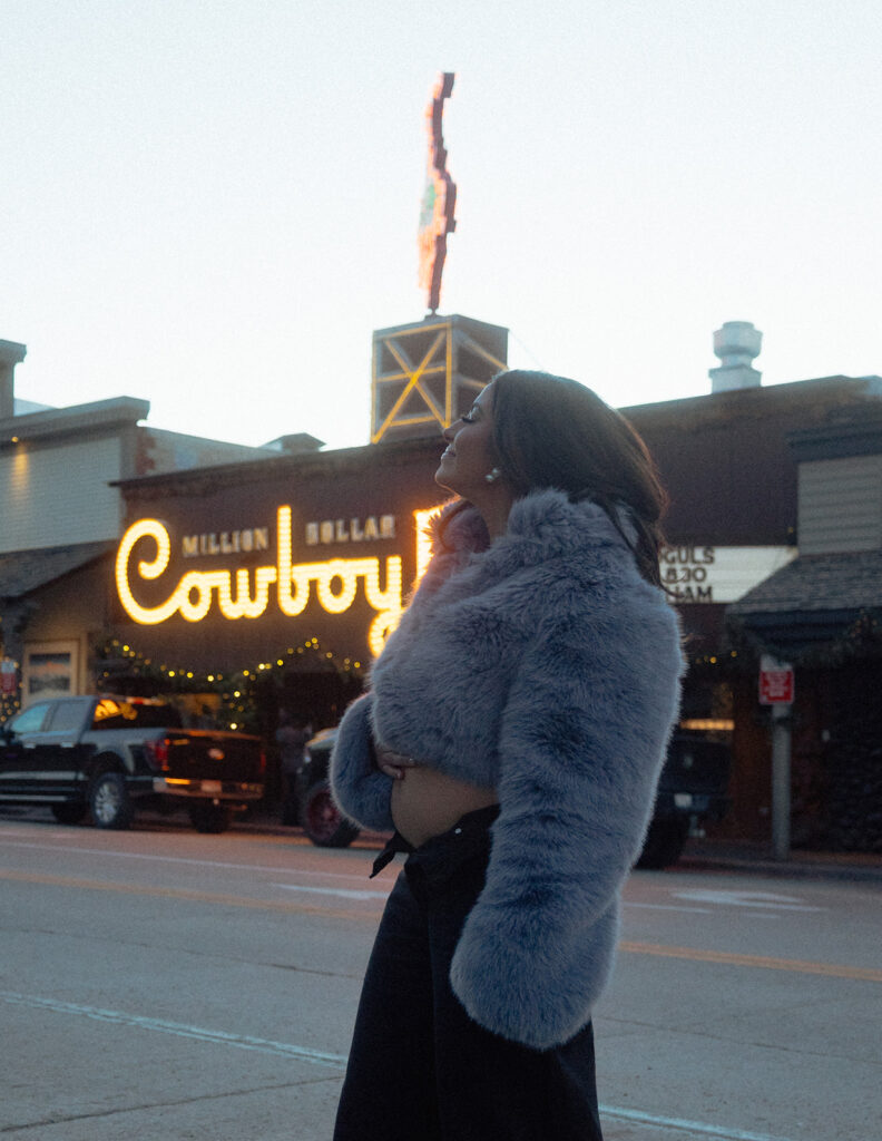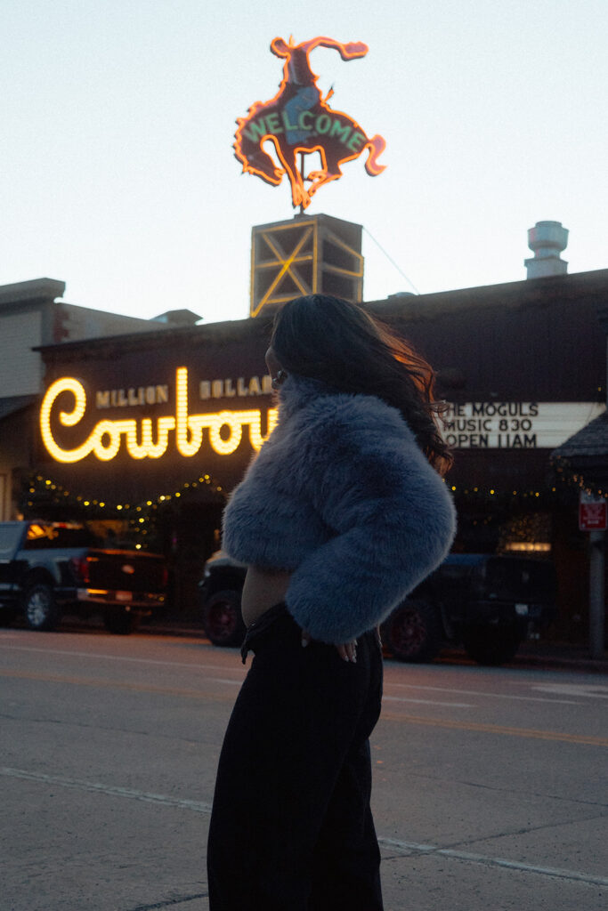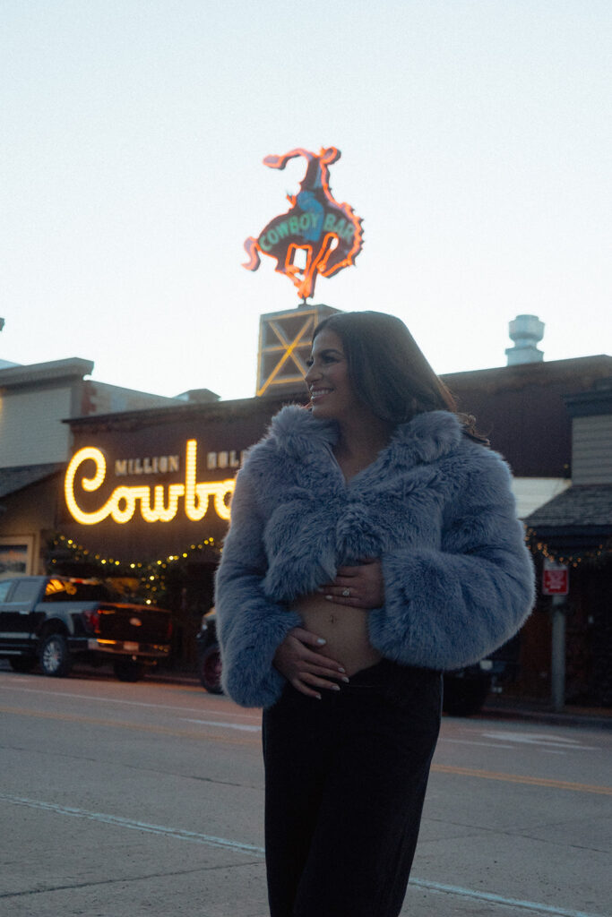 Later that evening, we captured a few celebratory portraits at the iconic Million Dollar Cowboy Bar. Jen changed into a cozy fur coat with black jeans, and the energy shifted into pure joy — relaxed, celebratory, and full of excitement for what’s to come.